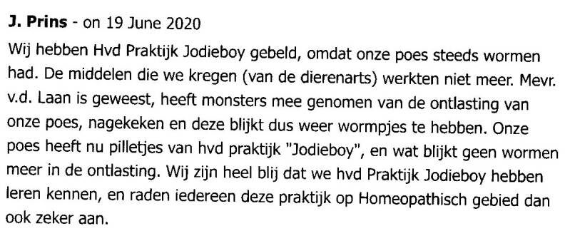 Voor onze hond Boris is homeopathie echt een redding geweest. Hij heeft nu bijna al een half jaar geen longontsteking gehad, en het spugen wordt ook steeds minder. Wij zijn heel blij dat we Marja van Homeopathie voor dieren praktijk Jodieboy ontmoet hebben, die heel wat tijd in ons gestoken heeft. Heel veel dank daarvoor, en we raden je zeker aan Marja!!!