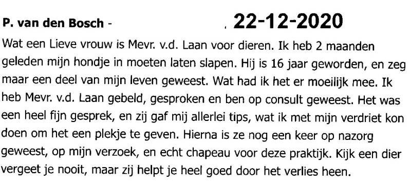 Onze poes heeft last van epilepsie. De middelen van de dierenarts werken niet optimaal meer. We hadden een afspraak gemaakt, en Mevr. v.d. Laan kwam langs. Toevallig toen zij er was, wat niet leuk was, kreeg onze Truusje een epileptische aanval. Mevrouw van der Laan griste uit haar tas een flesje, en gaf gelijk aan Truus een paar druppels in haar wangzak. Truusje kwam hierdoor heel snel uit haar aanval. Ze is echt voor ons fantastisch. Ze heeft uit haar auto een nieuw flesje gehaald, en dit moeten we 2x daags geven. Chapeau Truusje heeft tot op heden, en dat is nu 3 maanden geleden geen ene aanval meer gehad. Ik raad deze praktijk dan ook zeker aan. Groeten van Ester.